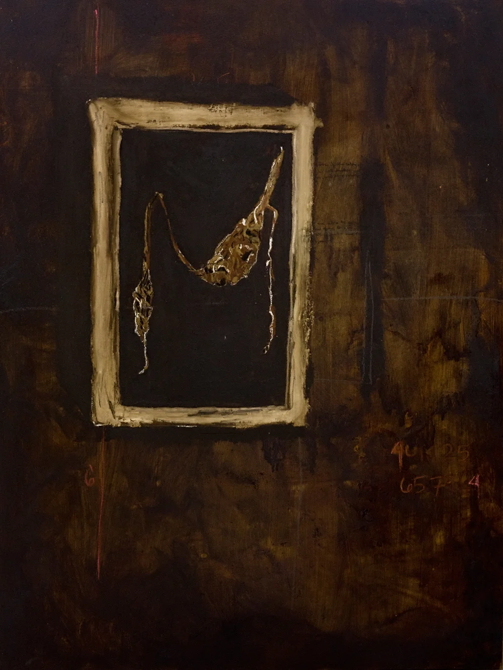 Oil paint, stain, tar, graphite, conte, pastels and urethane on board, 4'x3'x2"